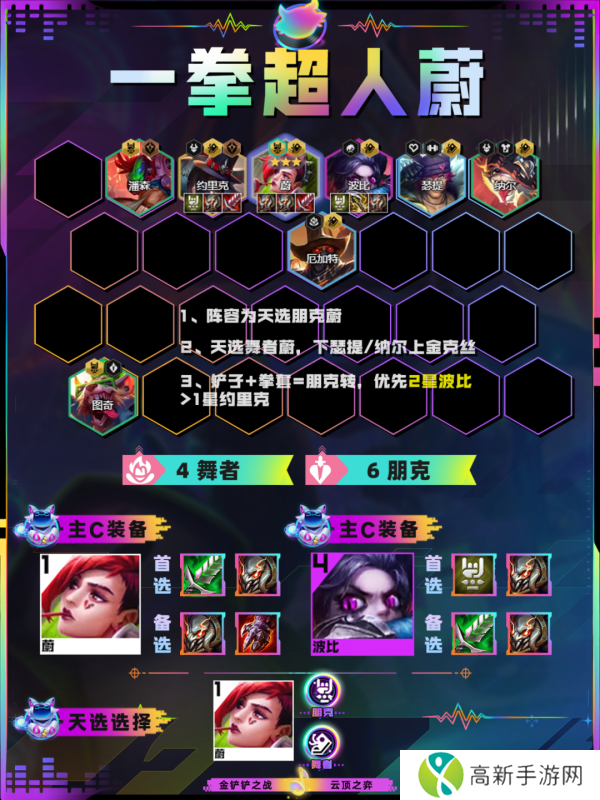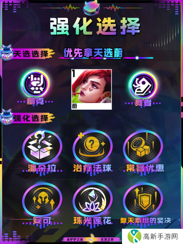 优先拿天选朋克蔚,这样能够保证开出6朋克羁绊,这个是最高的提升。如果是天选舞者蔚,需要有2个朋克转职(2个铲子)要求较高