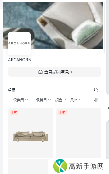 我们在品牌页中点击【查看品牌详情页】则会跳转到品牌详情页,下方则对品牌内单品素材展示,可以进行【类目】、【颜色】、【风格】筛选查找,也可以点击搜索输入关键字搜索。