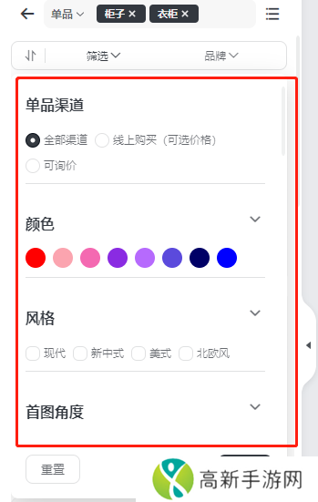 进入一级类目与二级类目后,则会展示标签筛选项,我们可以以单品渠道、颜色、风格、首图角度、类目特色标签进行筛选,可以以综合或者最新排序筛选,也可以筛选品牌,选择首字母检索。