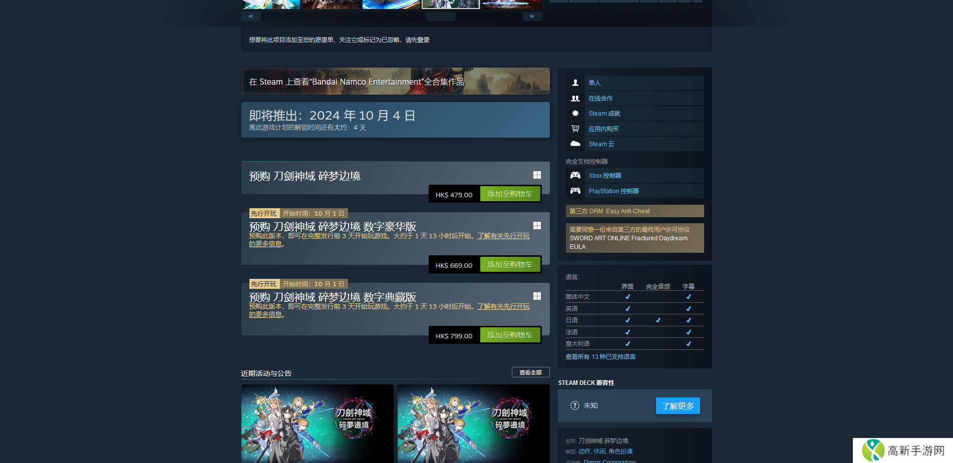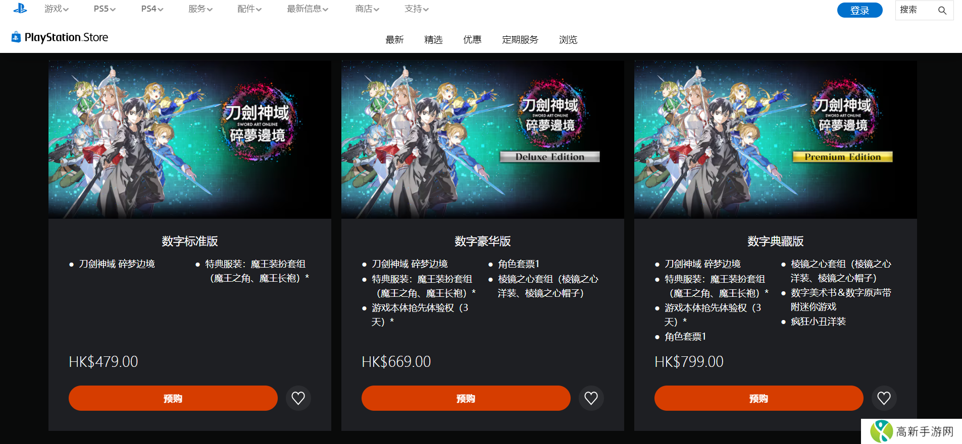 《刀剑神域 碎梦边境》在PS平台也有标准版、豪华版和典藏版三个版本,售卖价格分别是港币479元、669元和799元。