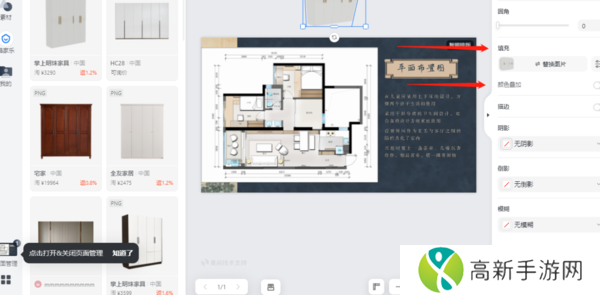 包含【画布属性】、【位置尺寸属性设置】、【圆角设置】、【不透明度】、【混合模式】、【填充】、【文字设置】功能。属性栏右侧点击箭头可以收起。