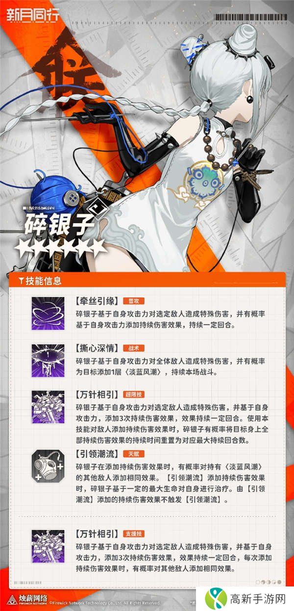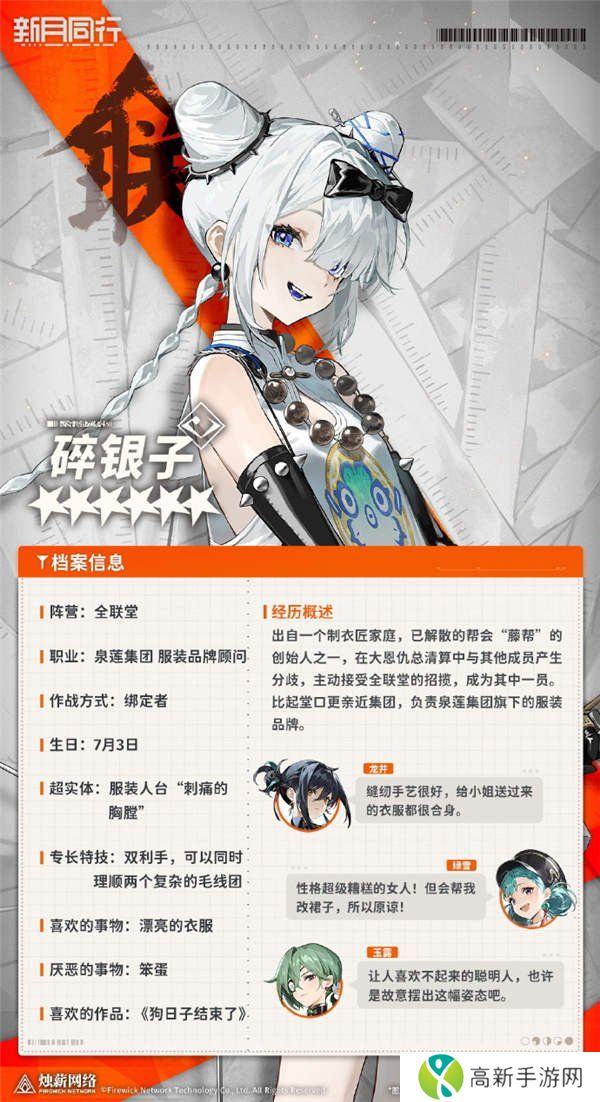 新月同行碎银子技能介绍,六星绑定者碎银子。出自一个制衣匠家庭,已解散的帮会“藤帮”的创始人之一,在大恩仇总清算中与其他成员产生分歧,主动接受全联堂的招揽,成为其中一员。比起堂口更亲近集团,负责泉莲集团旗下的服装品牌。