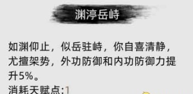 效果:如渊仰止,似岳驻峙,你自喜清静,尤擅架势,外功防御和内功防御力提升5%。
