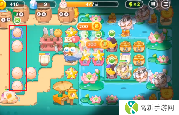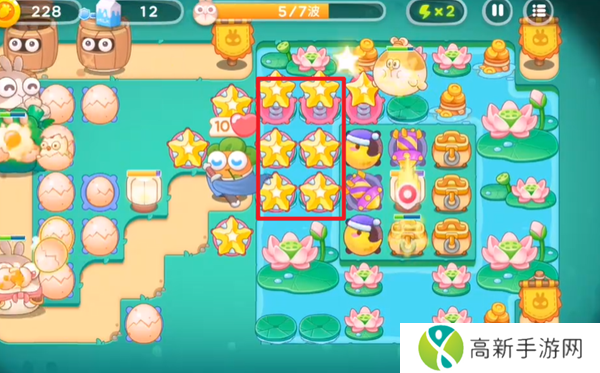 6、将左边和右边接近道路的格子全部摆放炮塔,左边是鸡蛋壳,右边是星星。