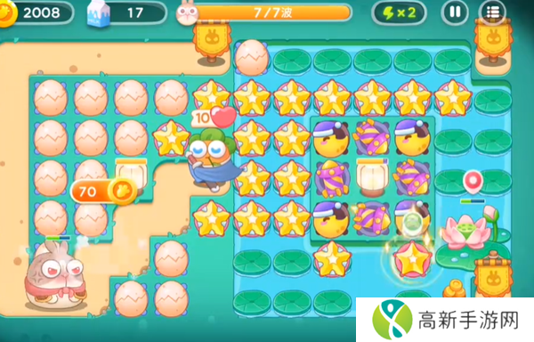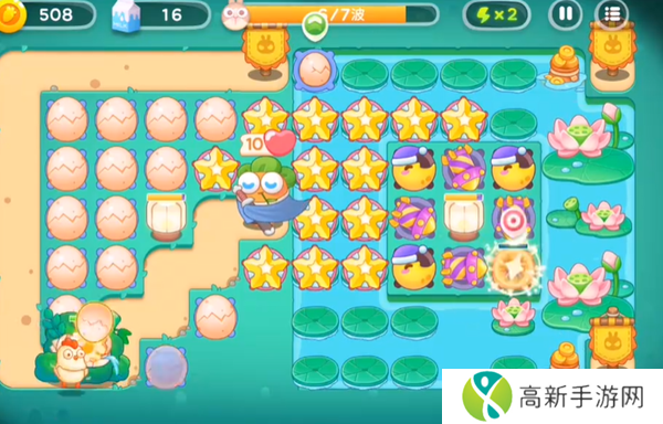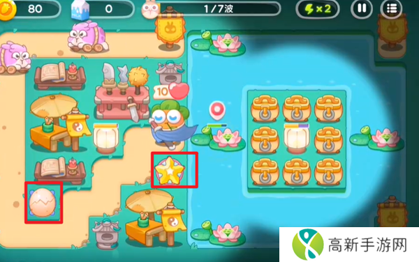 1、首先在萝卜的下方放置一个星星炮塔,然后瞄准右边的道具,用来开格子,左下角的蛋壳打怪物。