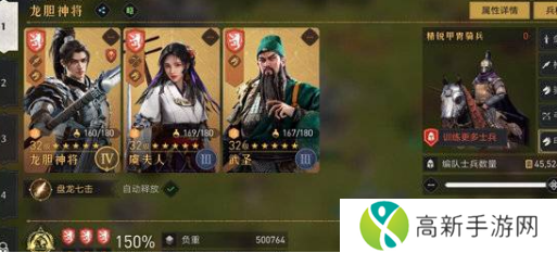 以赵云为核心的连击阵容,有很高的爆发力,以超高的伤害终结战斗,在前期无论是PVP还是PVE都是非常好用的,可以帮助玩家快速发育。该阵容包含了龙胆神将(解锁手册获得)、虞夫人(免费送)、武圣(首充获得),获取方式都比较简单,对于平民小氪玩家来说是一个不错的选择。在兵种选择上使用骑士,这三个英雄都是具有骑士羁绊的,其中龙胆神将主力输出,虞夫人在三号位给他们两个加状态。