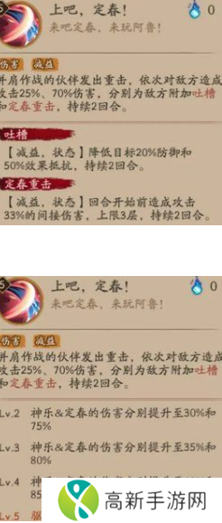 神乐普攻是少有的两段攻击,同时会给敌方附加吐槽和定春重击,这两个名词也是配合人设,只要看效果,分别是:降低目标20%防御和50%效果抵抗;回合开始前造成攻击33%的间接伤害。而普攻升级到LV5后还会额外驱散敌方一个增益。