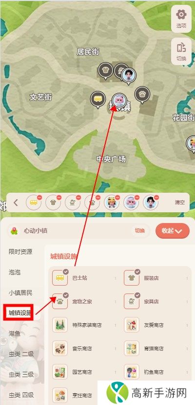 2、选择城镇设施,然后会有巴士站、服装店、家具店这些地图信息,勾选以后就会相对应的在地图上显示出位置来。