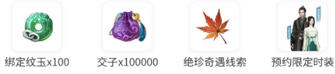预约礼包内容:绑定纹玉x100、交子x100000、绝珍奇遇线索、预约时装