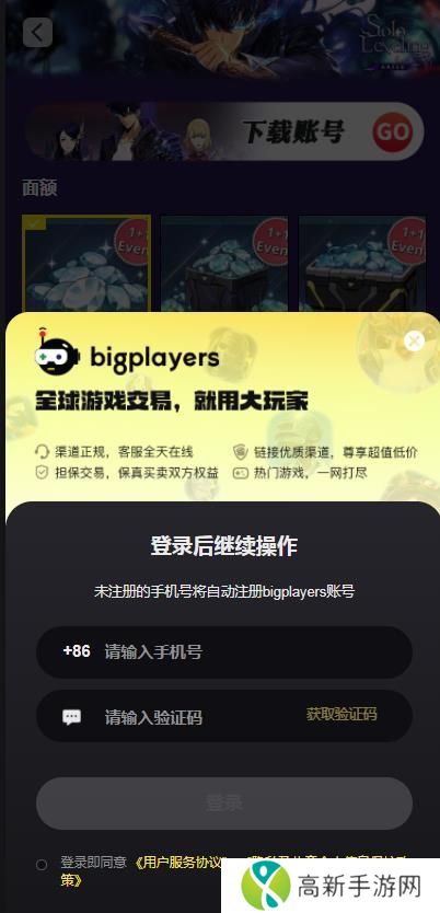 2.这时即为提示用户需要进行登录你的bigplayers账号,对于新用户来说,只需要输入手机号、短信验证码即可注册并登录成功。
