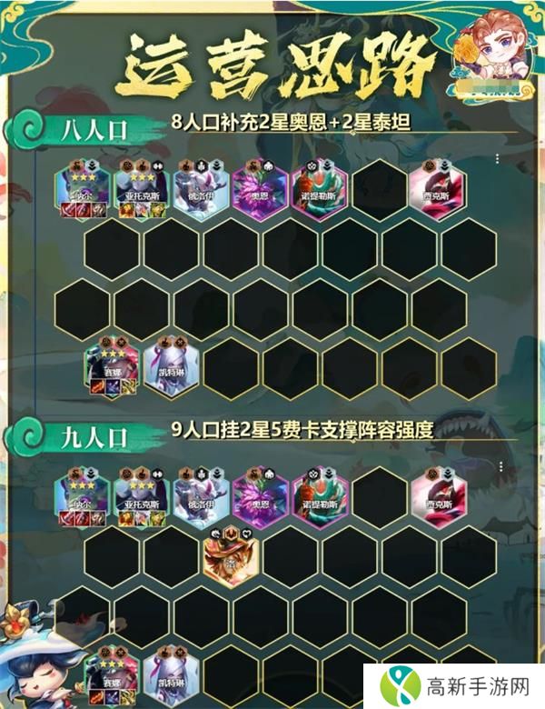 护卫转→剑魔/贾克斯,7人口补充俄洛伊或者阿木木开出4护卫羁绊,8人口补充莫甘娜开出4幽魂