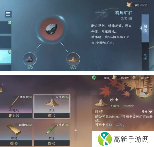 4、然后我们可以在工艺的列表中查看精炼矿石需要哪些原料(2个粗铁矿和7个沙子,沙子我们可以直接在集市上金兴沟10个铜币一个沙子);