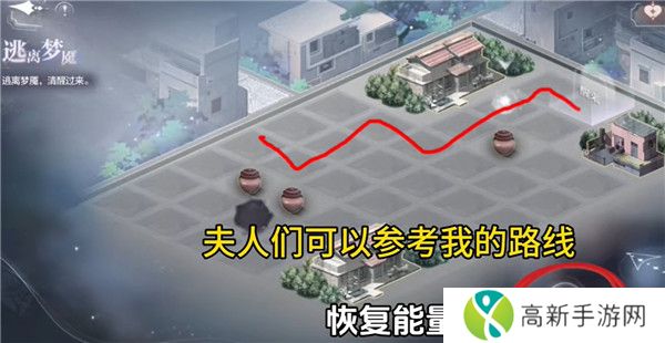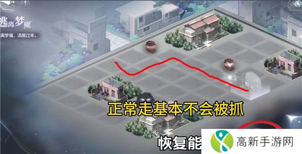 1.第一关当中,玩家只需要按照下图给出的路线图,正常走基本上不会被抓,就能够醒来,如果没有能量的话,记得恢复能量。