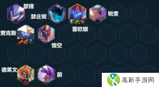 1、阵容搭配:贾克斯+瑟提+瑟庄妮+蕾欧娜+锐雯+悟空+德莱文+蔚