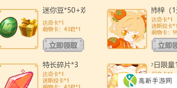 卡片兑换:每日进入页面可概率抽取卡片,使用卡片可兑换相应礼包,其中: