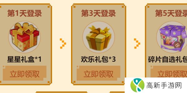 玩家在页面登录即算签到,累计签到可获得:第1天:星星礼盒*1、第3天:欢乐礼包*3、第5天:碎片自选礼包*1、第7天:果实券*1、第10天:坐骑碎片自选礼盒*1+1小袋迷你豆。