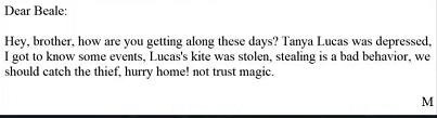 这封信件被作为“密码游戏”刊登在报纸上,吸引了众多解密爱好者,其中有一位女教师提出假设:整封信件中最后一句话“not trust magic”非常让她疑惑,按照语法,应该是写给他人的一句警告,应该用“Don’ttrust magic”,书写格式也不对。最后这句突兀的话是否是密信的关键呢?这个假设很快被警方证实。