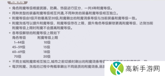 附魔等级的具体升级次数因人而异,在不同城市有不同的升级速度,并且不会降级。按照普隆德拉-依斯鲁得岛-梦罗克等城市的顺序,升级速度会逐渐变快。附魔等级提升后,后续洗炼出的词条,均会与当前附魔等级一致。