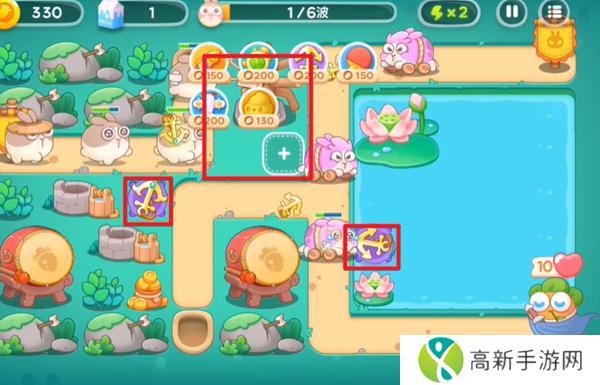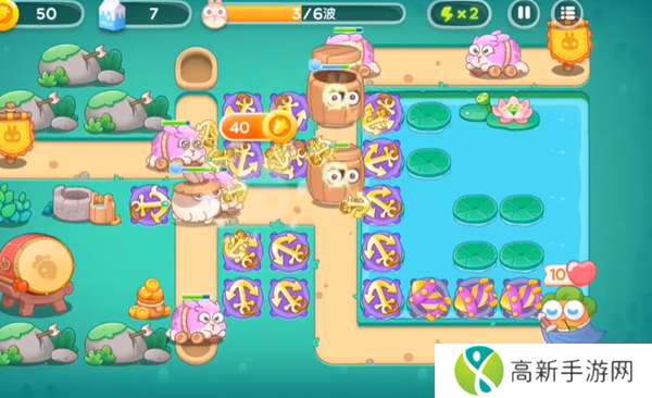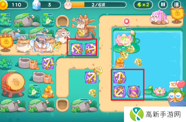 3、利用拆除障碍物所得到的经济,前往水面上建造炮塔。这么做的目的是为了防止从第四波开始出现的飞行兔子。飞行兔子具有特殊的移动方式,如果没有提前做好防御措施,很容易对我们的防御体系造成破坏。