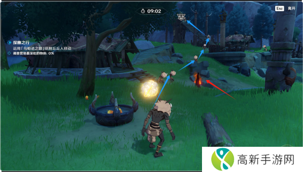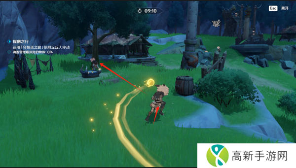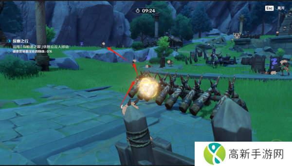 1.原神奇境谜丘探幽行第一天经过第一只萨满后我们利用水琥珀让前面这只丘丘人跑起来让传送到围栏处的丘丘人身上。
