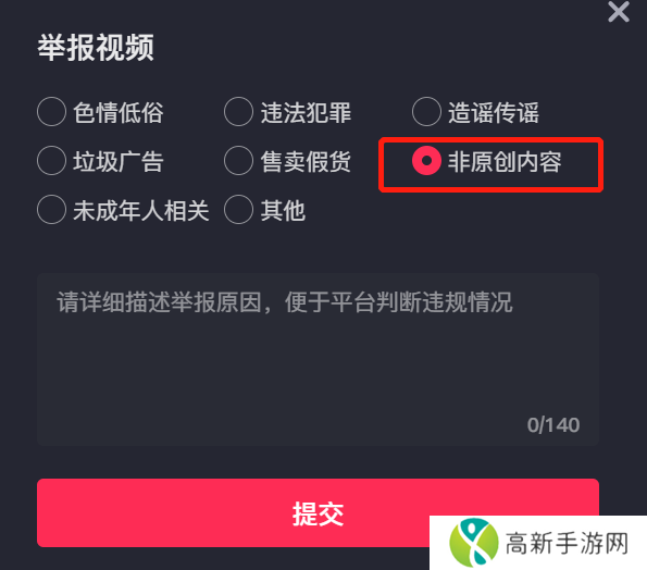3、在弹出的举报内容选项中,我们选择“非原创内容”,并在下方的文本框内输入举报原因。