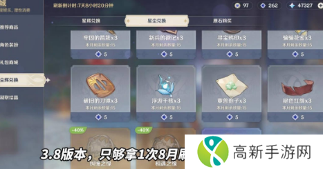 时间线,3.8版本是从7.5至8.15,持续42天。期间会经历2次深渊刷新,若是都能满星可得1200原石;星辉商店则是仅刷新一次8月,5纠缠之缘、5相遇之缘,这块仅将粉球算作为800原石;每日委托,全勤共计2520原石。