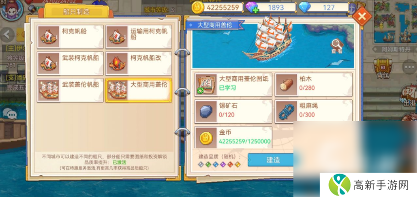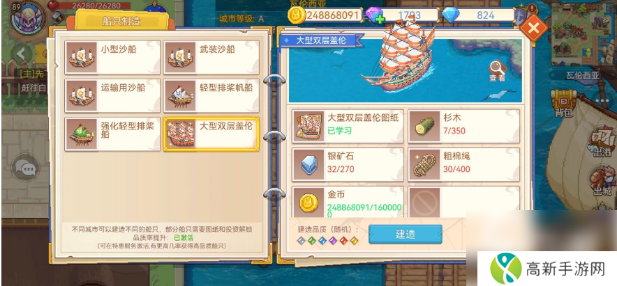 有一艘船叫做大型双层盖伦,需要的材料有杉木350、银矿石270、粗棉绳400以及金币160万到达瓦伦西亚,寻找工匠就能建造这艘大型双层盖伦了。