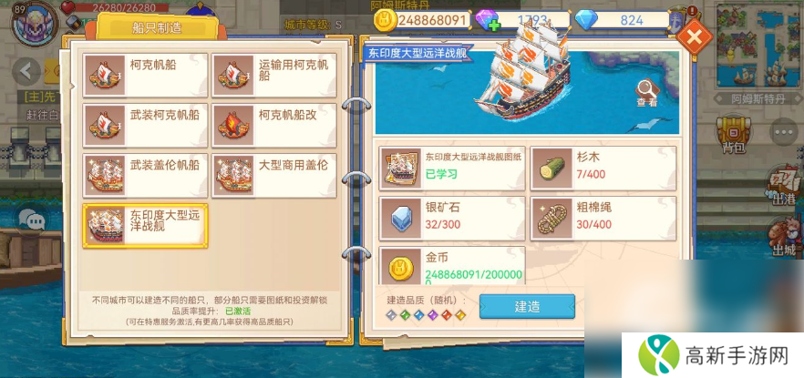 终于说到最后一个战船了,名叫武装盖伦帆船,这艘战船的图纸需要玩家前往凯默尔山脉获取,接着去到伦敦。带好所需的材料180根樟木、铁矿石220个以及韧麻绳300根和140万金币。就可以建造完成啦!
