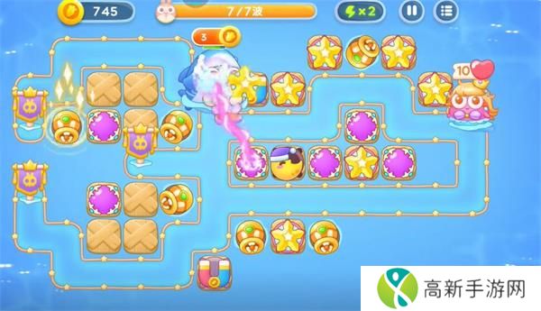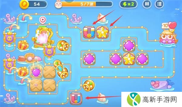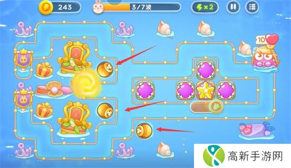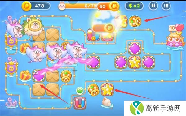 5.清理掉左侧的障碍物,建造魔法球,同时补充星星塔对空中的兔子进行攻击,在右上方补充一个鱼雷对潜水的兔子进行补刀。