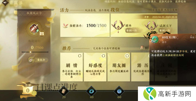 1、在游戏主页面右上方点击“青崖书”图标,通过完成该页面的任务和活动,累计2500的风云令后即可获得委托令。