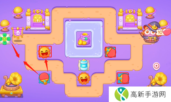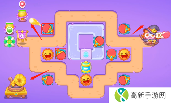 2.优先清理小中道具,清理掉继续放置,太阳花曾家山伤害,右边放置乒乓球清理道具,宝箱给的是负电极。