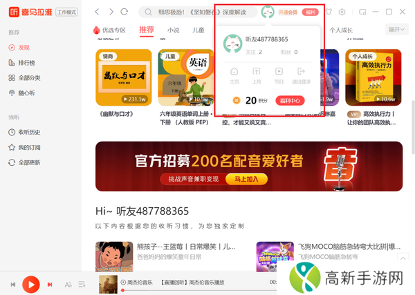 喜马拉雅是一款非常受大家欢迎的音乐播放器,它提供了大量的音乐资源,其中包括中文歌曲、欧美、日韩歌曲,还提供有声小说、脱口秀、儿歌和儿童故事、相声、实时快讯、人文社会、新兴科技等,我们可以通过搜索和浏览