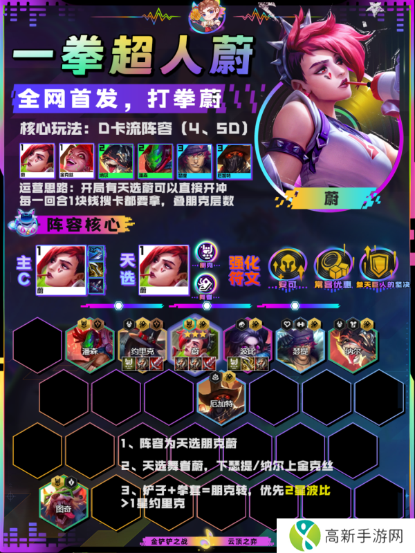 金铲铲之战一拳超人蔚怎么玩?金铲铲之战一拳超人蔚阵容怎么搭配?下面小编给大家整理了金铲铲之战一拳超人蔚阵容推荐攻略,快来看看吧!金铲铲之战一拳超人蔚: 1 金铲铲之战一拳超人蔚阵容组成:蔚、金克丝、潘