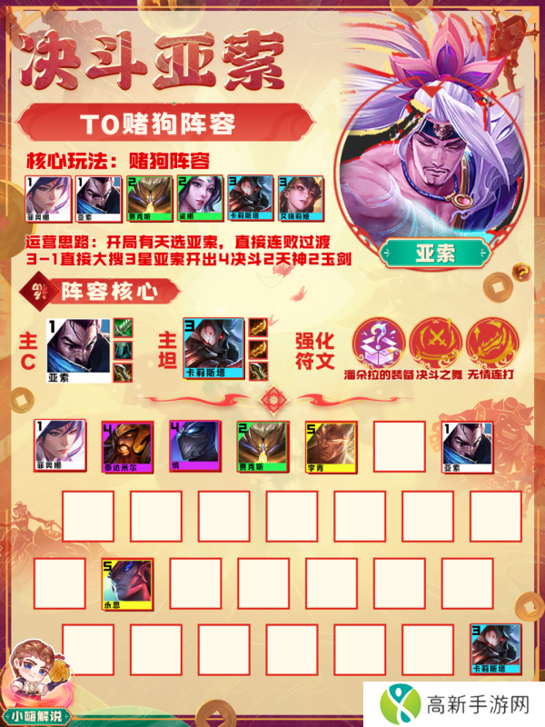 金铲铲之战决斗亚索怎么玩?金铲铲之战决斗亚索阵容怎么搭配?下面小编给大家整理了金铲铲之战决斗亚索阵容推荐攻略,快来看看吧!金铲铲之战决斗亚索: 1 金铲铲之战决斗亚索阵容组成:亚索、菲奥娜、贾克斯、卡