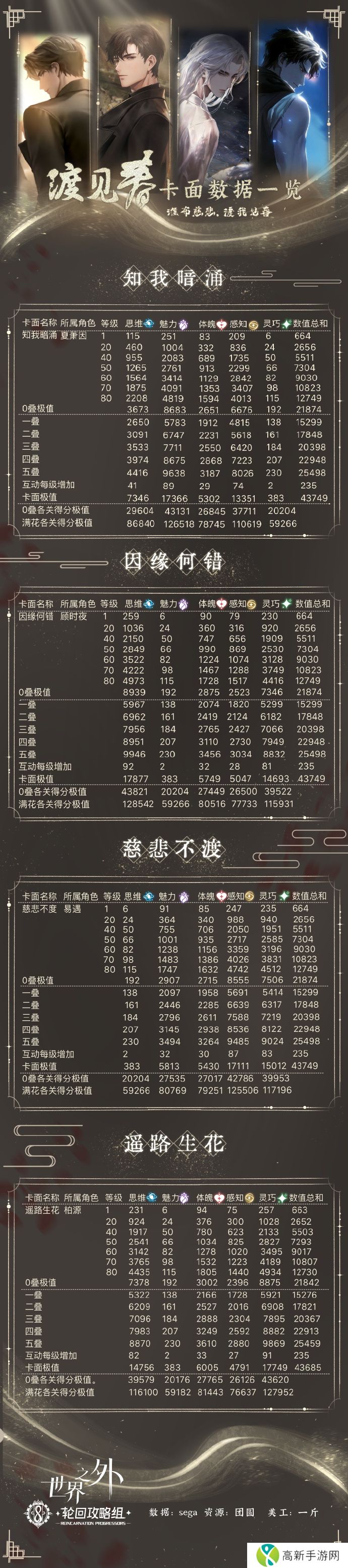 渡见春最新活动卡面主题分别为知我暗涌—夏萧因、因缘何错—顾时夜、慈悲不渡—易遇、遥路生花—柏源四个,每个都根据卡面名称、所属角色、等级、思维、魅力、体魄、感知、灵巧、数值总和、0叠、一叠、二叠、三叠、
