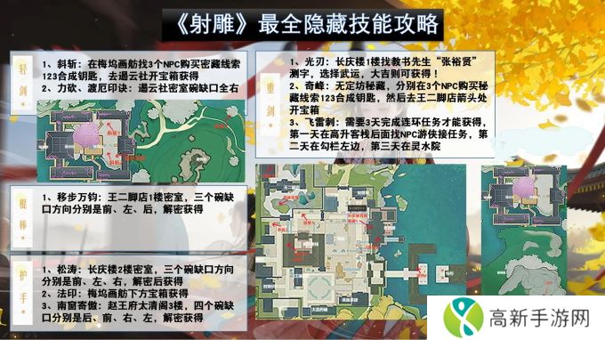 射雕隐藏技能怎么获得?射雕隐藏技能获得方式是什么?下面小编给大家整理了射雕隐藏技能获得大全最新,快来看看吧!射雕隐藏技能:1 射雕斜斩隐藏技能:在梅坞画舫找3个NPC购买密藏线索123合成钥匙,去遏云