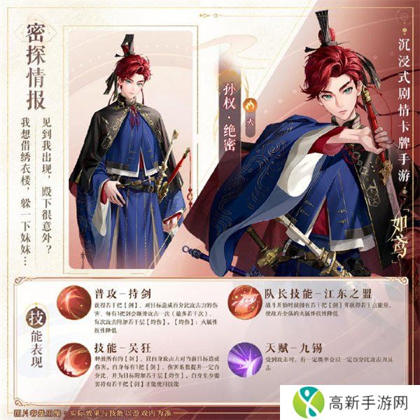 如鸢孙权技能介绍,命盘可洗盾权。江东子弟多才俊,今与绣衣卷土来。“弓剑江东”卡池限时概率提升,全新密探孙尚香、孙权即将登场!活动时间:10 01 维护后- 11 18 23:5