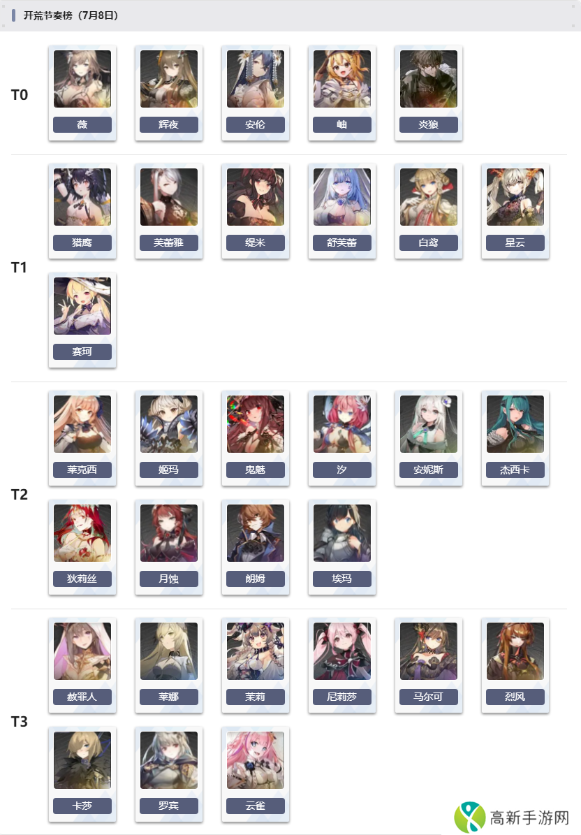 异世界扫荡大冒险手游《星落》将在7月23日正式公测!今天就为玩家们带来基于三测的数据制作的节奏榜,祝大家开荒顺利!梯度详解:T0:最推荐养成的角色,拥有各职业中顶级的实力。T1:构成队伍主力的角色,各