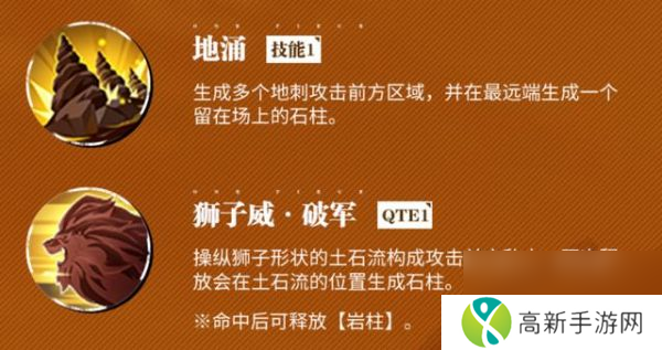 1、技能简介 1技能【地涌】生成多个地刺攻击前方区域,且在最远端生成石柱留存场上。 给的追加技是【狮子威破军】,操控狮子形状的土石流攻击前方敌人,再次释放会在土石流的位置生成石柱。备注有提该技