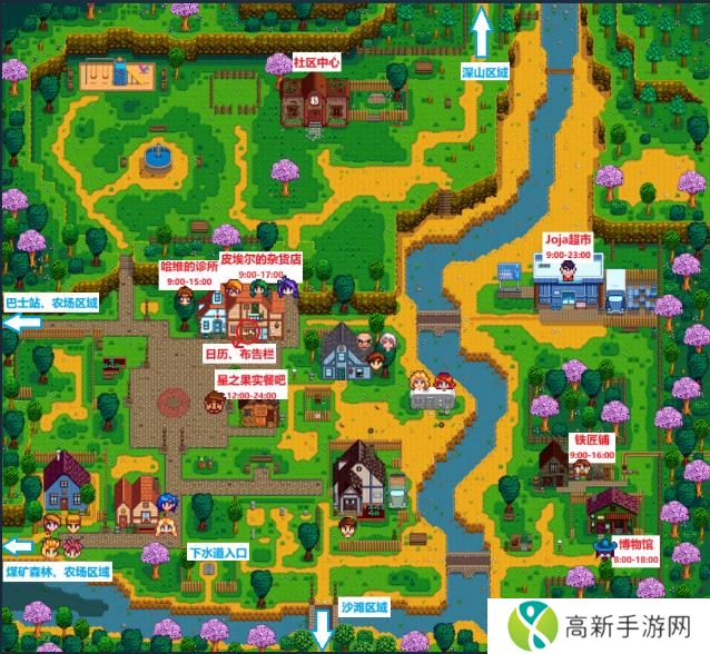 本次为大家带来星露谷物语地图详细图解的分享了,大家都知道这游戏的地图非常的大,每一个建筑物都有对应的功能设施,不少玩家可能会往往忘记,甚至迷路了,在这里小编就整理了全地图攻略,下面就一起来看下吧。城镇