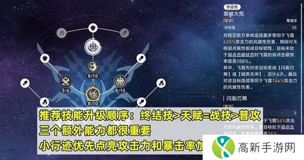 推荐技能升级顺序:终结技>天赋=战技>普攻。飞霄最主要的输出来源就是终结技,所以优先升级。不过飞霄天赋的追加攻击,以及战技也有一定的输出占比,如果有资源的话推荐都尽量升级。普攻基本很少用到,所以可以不