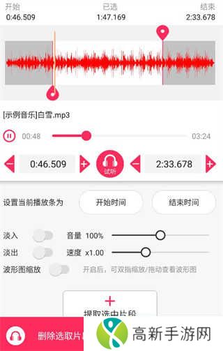 5、拖动调整截取音频时段,还可手势缩放/拖动查看波形图细节