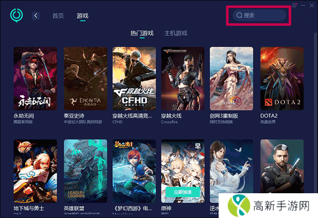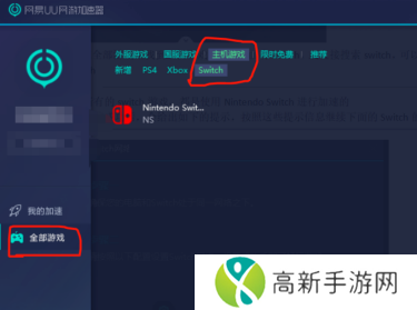 1、在全部游戏里找到主机游戏选项,里面有Switch选项,也可以直接在右上角搜索switch,可以看到Nintendo Switch。点击加速。