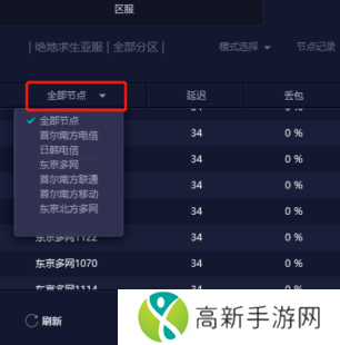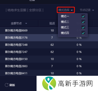 3、进去区服、节点选择界面之后,我们可以看到有许多个显示不一样的延迟、丢包评分以及不同模式的节点,可以在“模式选择”按钮中选择不同模式,可通过勾选单个或多个进行模式的选择切换。