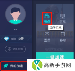 2、点击左侧“我的加速”,将鼠标移至刚刚添加的游戏图标上,就可以看到节点的操作选项,点击进去。