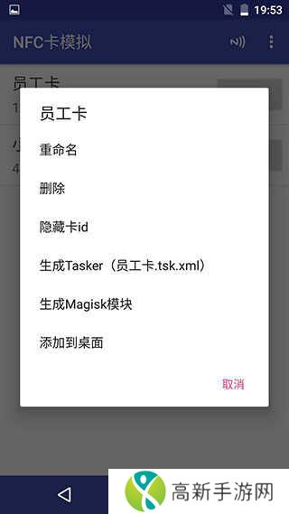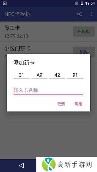 "NFC卡模拟"能添加和模拟4字节、7字节和10字节的卡id,一个字节用两位十六进制数表示