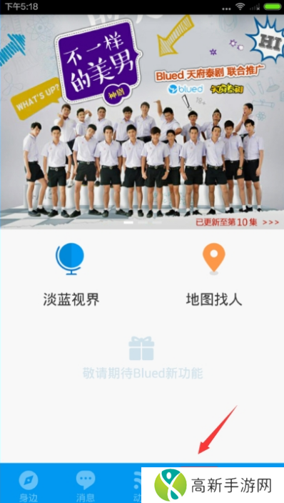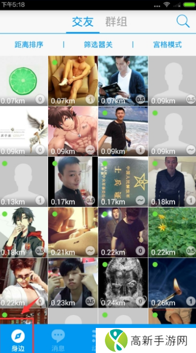 2、登陆成功后即进入到主界面,也就是身边页面,可以查看给你推荐的离你最近的基友信息,同时你可以根据距离排序、筛选器关、宫格模式进行设置。