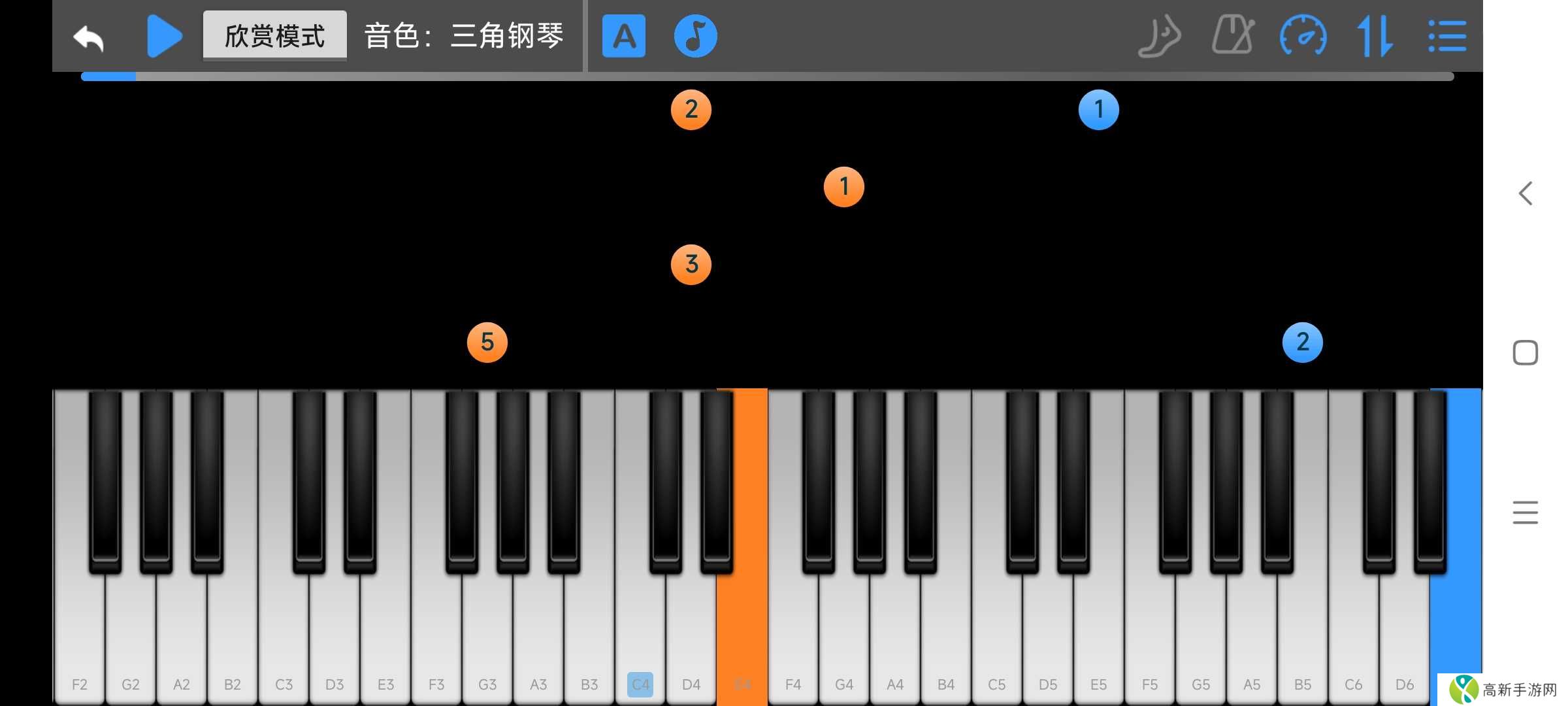 4、点击右边会显示钢琴全貌,会落下带有数字的小球,根着小球数字练习弹奏即可。