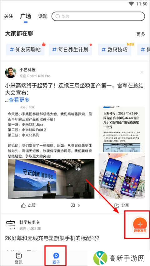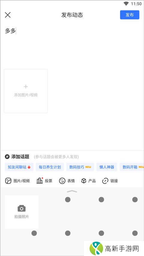3、输入要发布的内容,以及添加话题,图片等,最后点击右上角发布即可;