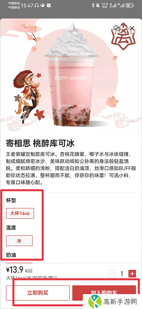 2、选择杯型、温度、小料等后,点击立即购买,若还需点其他的可以先将其加入购物车